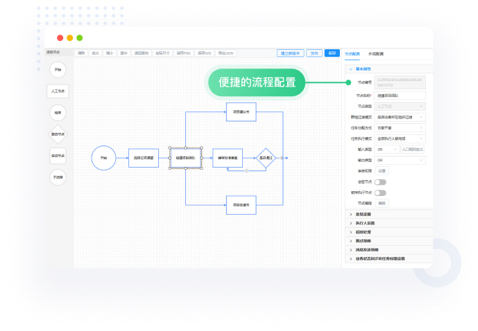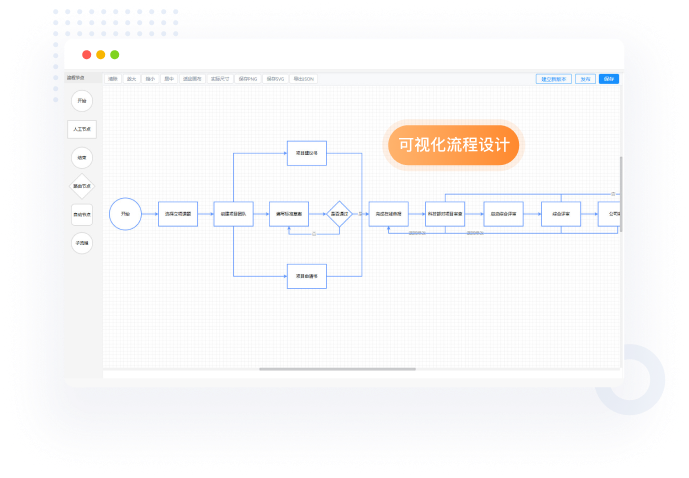 可视化流程设计,独立的工作流引擎,跨系统流程整合服务,涵盖了从流程梳理、设计、流程仿真、发布、管理配置、